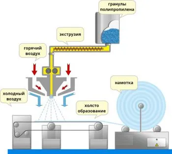 Холстообразование. Расплавленный полипропилен, проходя сквозь отверстия в фильере, подхватывается горячим воздухом и укладывается прямо на конвейерное полотно. В этот момент полипропилен застывает и образуется материал, состоящий из микроволокон толщиной от 1 до 5 микрон.
