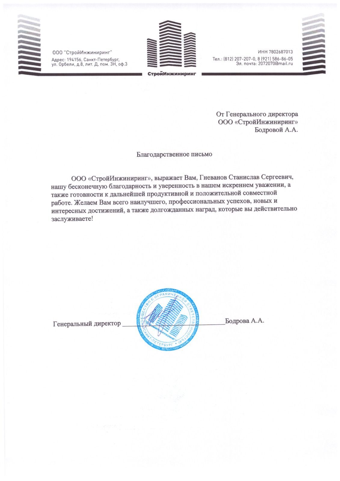ООО "СтройИнжиниринг", выражаем Вам, Гневанов Станислав Сергеевич, нашу бесконечную благодарность и уверенность в вашем искреннем уважении, а так же готовности к дальнейшей продуктивной и положительной совместной работе. Желаем Вам всего наилучшего, ...